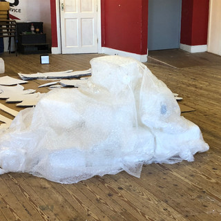 We set about gathering materials from local businesses; cardboard from Casey's Cycles, plastic containers and fishing net from Iveragh Fisherman's Co-Op, plastic bottles and milk cartons and even shredded paper from Siopashoo all contributed. Slowly, things began to take shape over the weeks with ideas evolving as materials arrived, some of which inspired us to change or evolve our ideas. Our bears began as gingerbread people, who became bears and with shredded paper from Siopashoo, our bears were no longer bare.