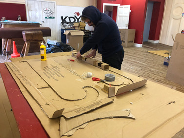 Work in progress, creating the decor for the waiting room; cardboard, paint and two artists